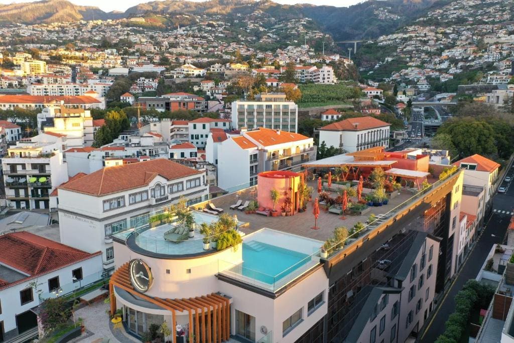 Het dakterras, gelegen boven de levendige haven van Funchal, is het hoogtepunt, met ligbedden, groen en een infinity-zwembad met zout water. Gasten kunnen ontspannen tussen potjes tafeltennis door, terwijl ze genieten van gerechten zoals taco's en Wagyu-burgers.